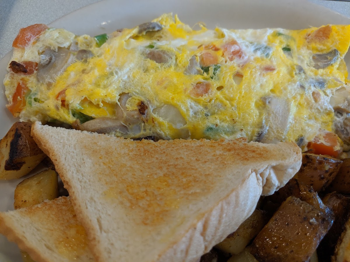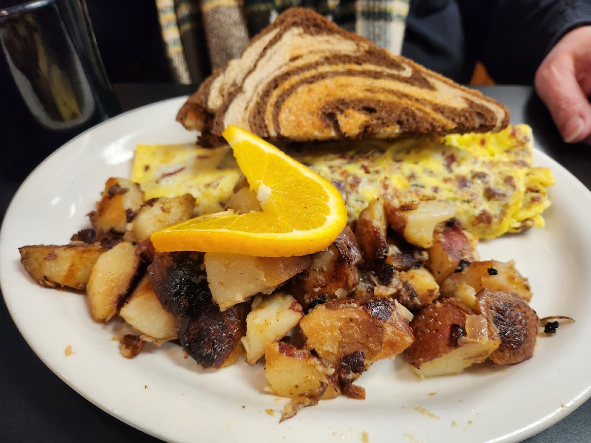 We like eating here wife had bacon and cheese omelet with home fries and rye toast. She enjoyed it. I had the deluxe French toast with fresh Italian bread cinnamon butter and powder sugar. Had four slices. Also two eggs and bacon. Everything was cooked perfect. But could hardly taste the cinnamon or power sugar. Server was great. Parking in front is tight. Plenty of parking in rear and rear entry. Also muffins chocolate chip and coffee cake to go. Very good.